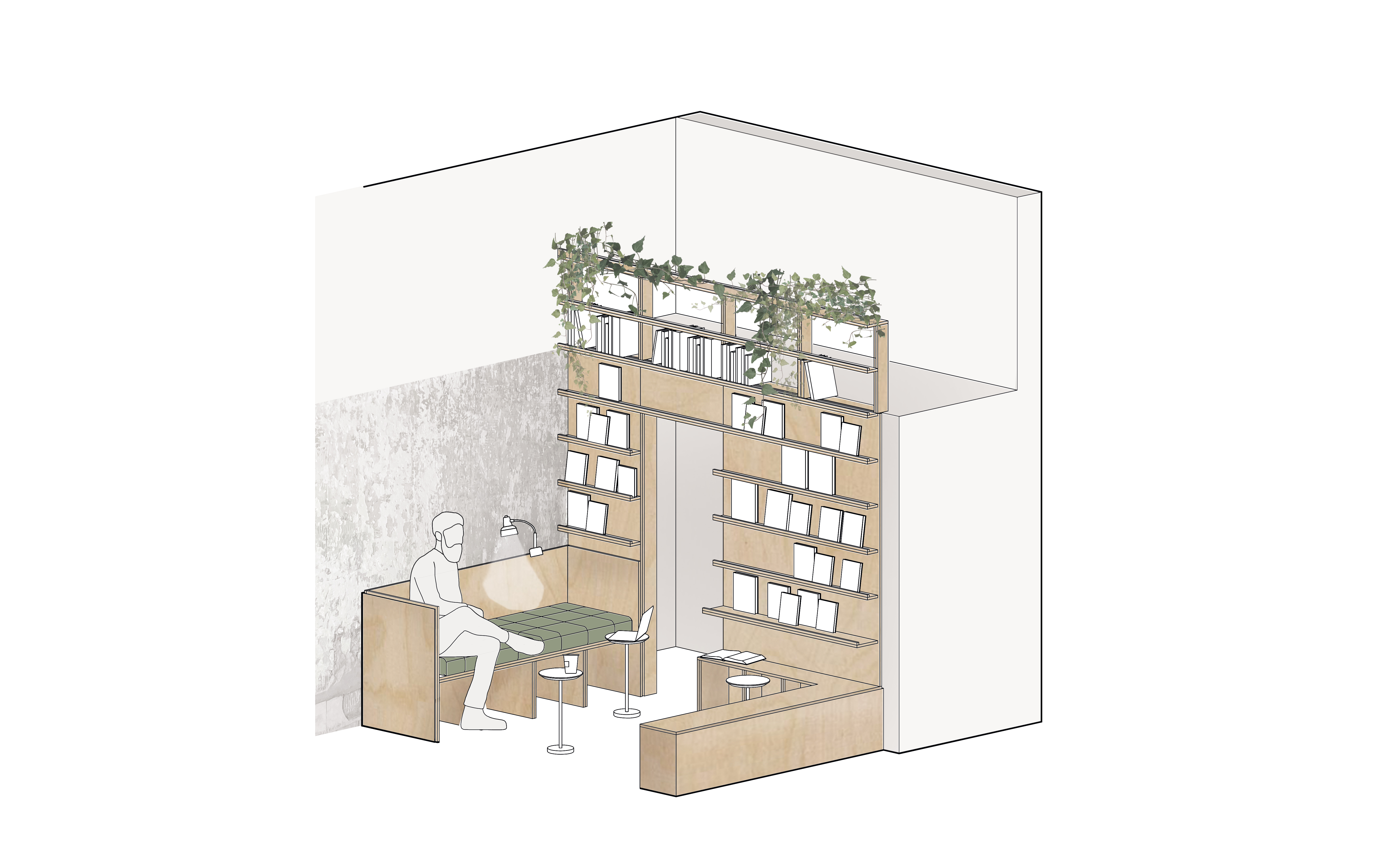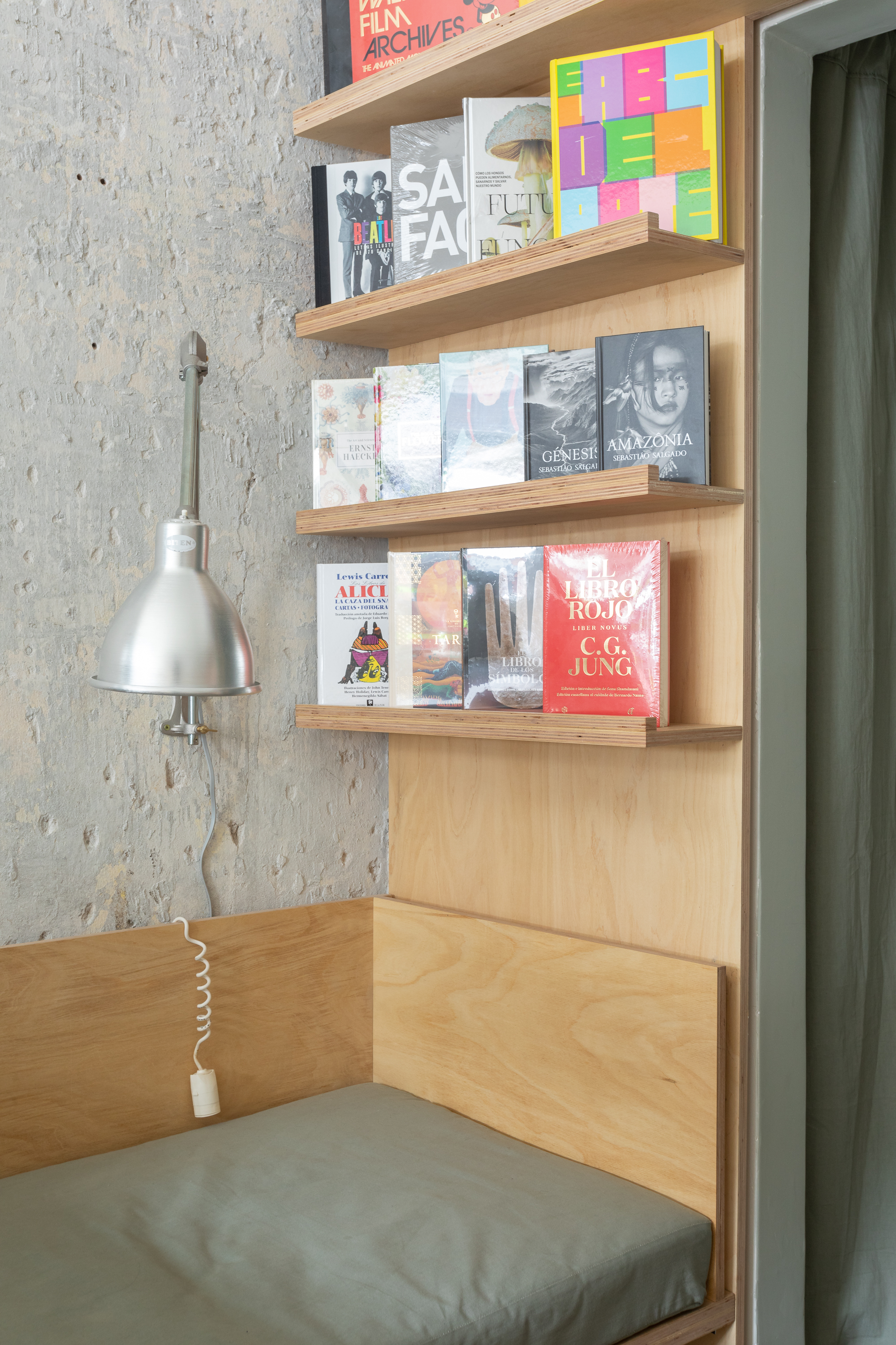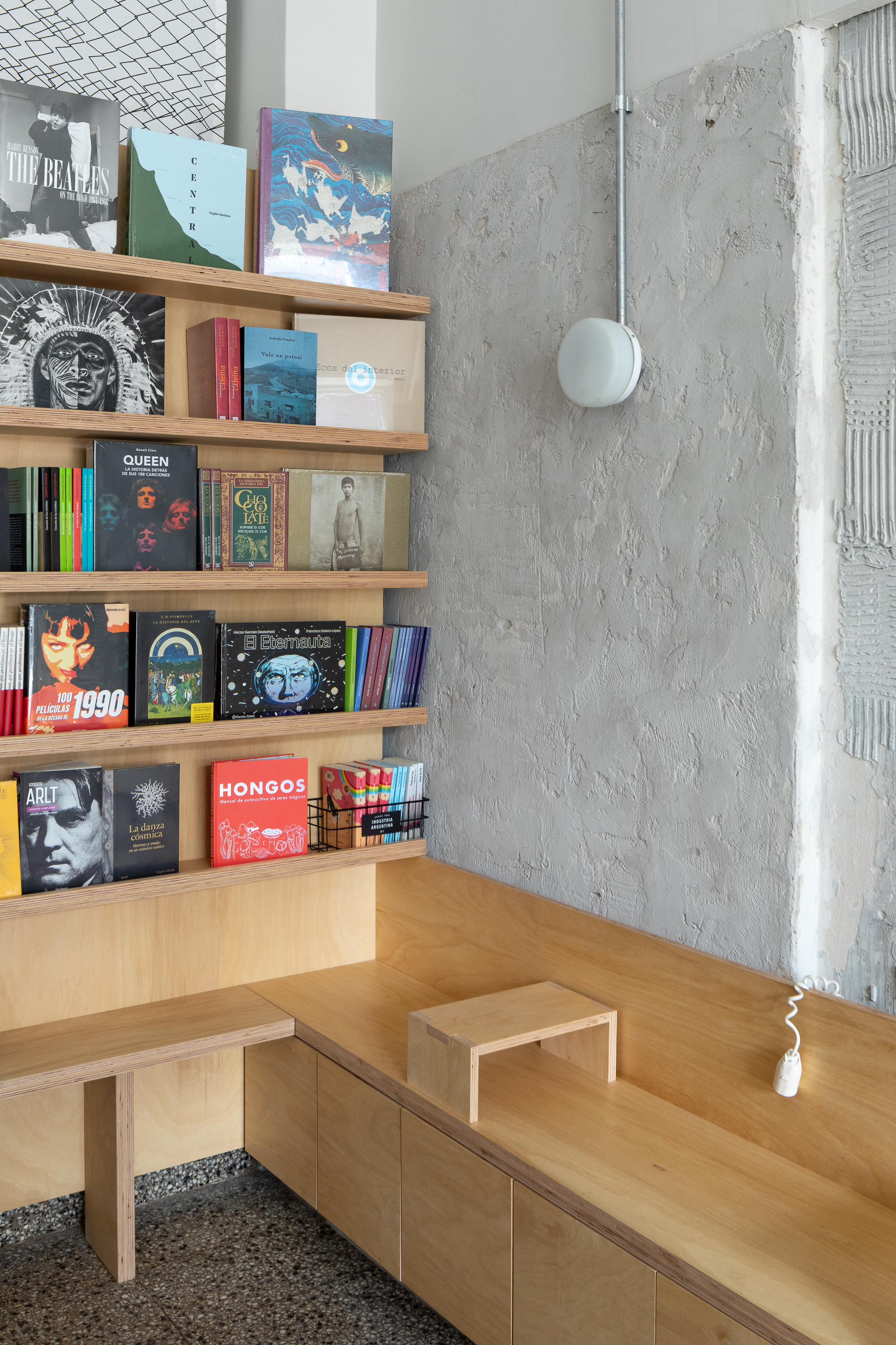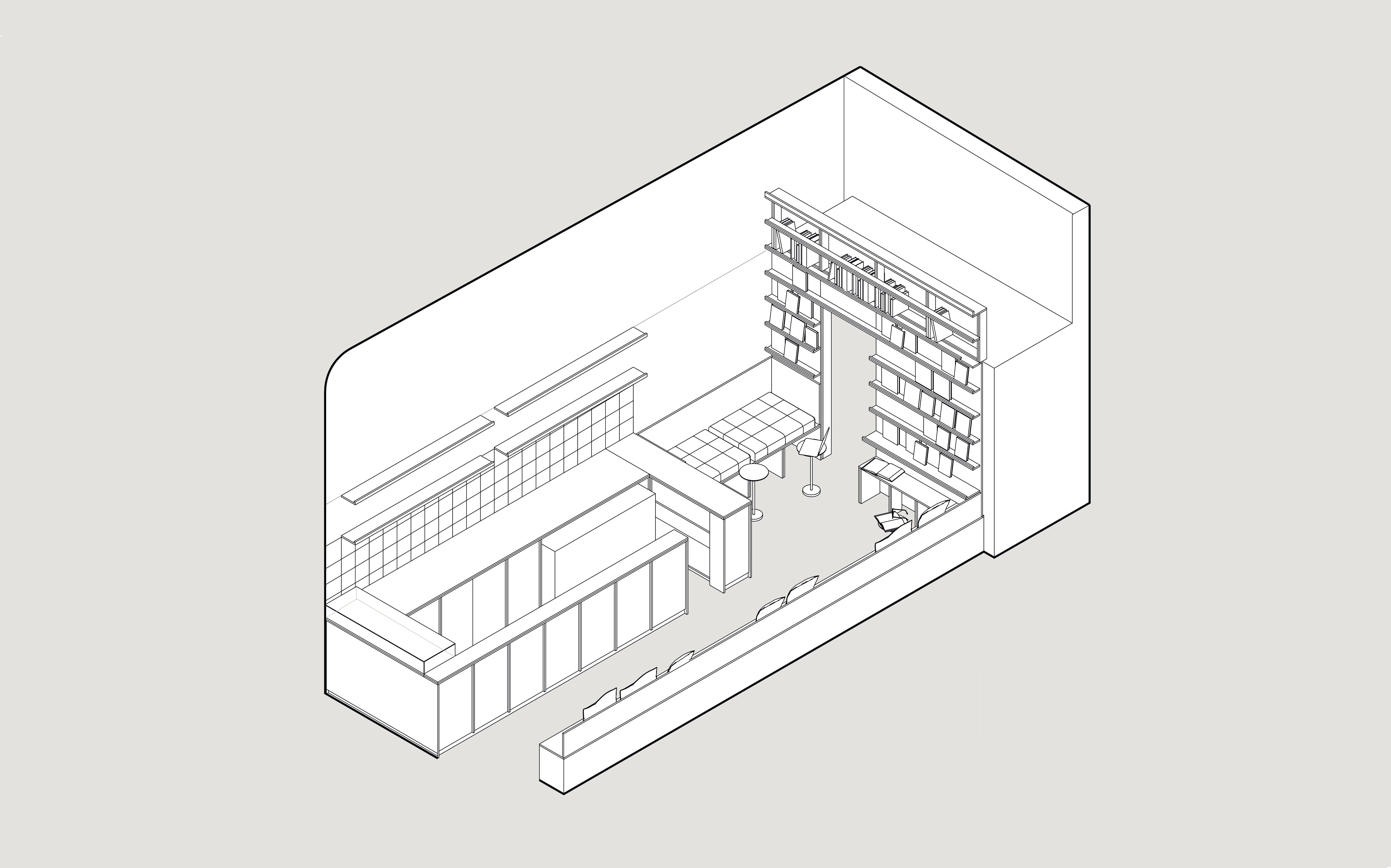 Para adaptar el espacio vacante al nuevo programa, optamos por incorporar un sistema mobiliario que recorra y configure el espacio unificando todo el conjunto. El sistema se compone por una barra, una biblioteca y dos bancos. Uno de los bancos, lineal y con espacio de guardado inferior, recorre toda la longitud del local, permitiendo experimentar, desde cerca la labor del barista. El otro, más ancho y confortable permite generar un rincón, definiendo un lugar donde relajarse a disfrutar de un libro y un café con calma.