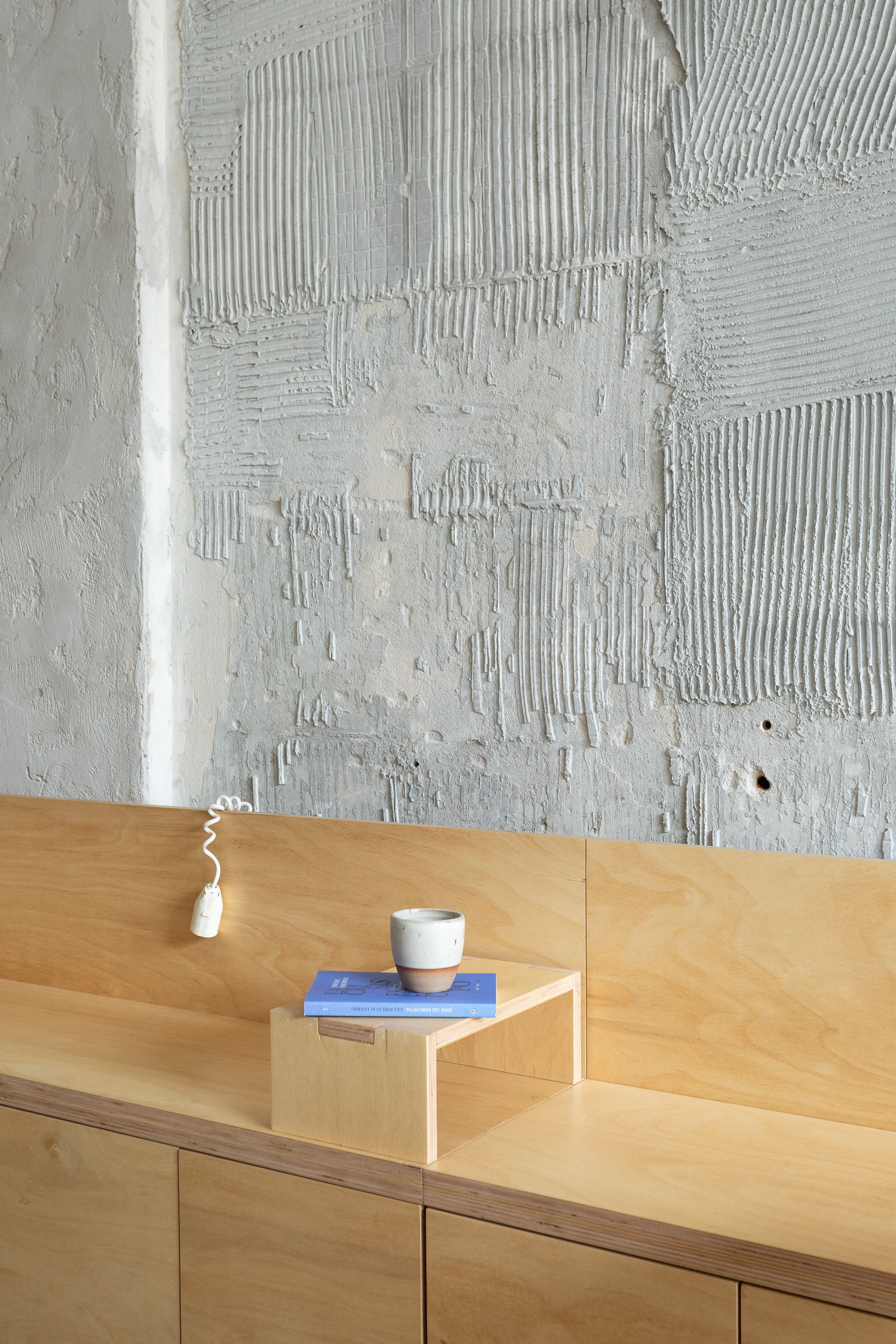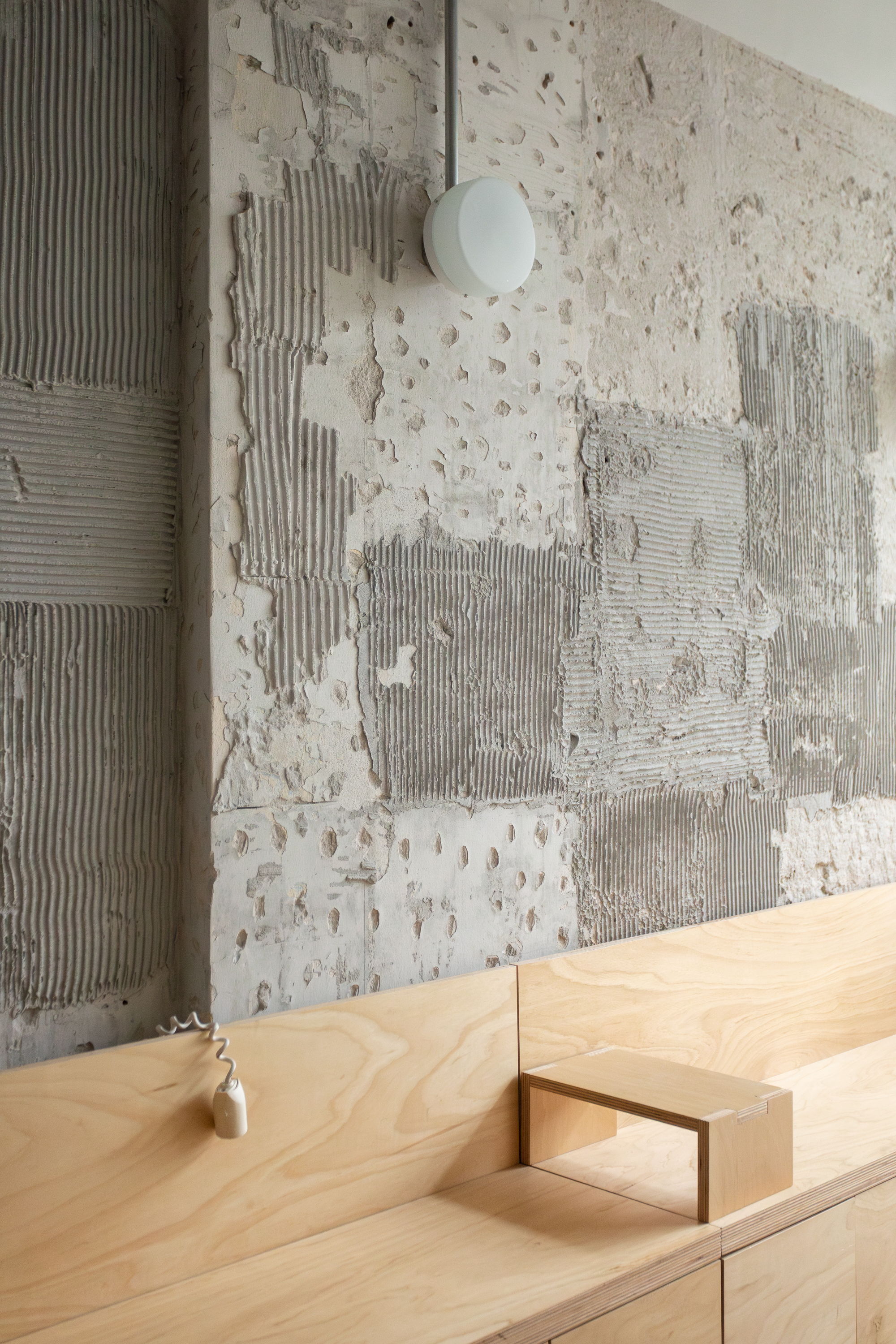 Tomamos como punto de partida la decisión de conservar las huellas preexistentes del lugar, haciendo hincapié en las marcas de las paredes y en las distintas capas de las mismas, que dan cuenta de los diferentes usos que allí se sucedieron. Las diversas texturas se unificaron cromáticamente mediante un acabado translucido que a su vez, da lugar a que se exprese la singularidad de cada capa. También decidimos preservar el solado existente, un tipo de baldosa granítica característica de las construcciones del Buenos Aires de antaño.