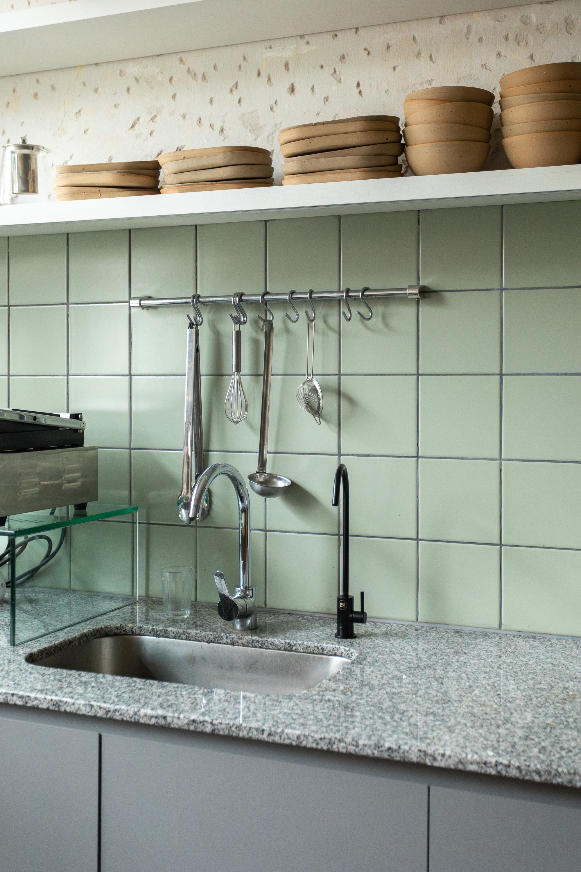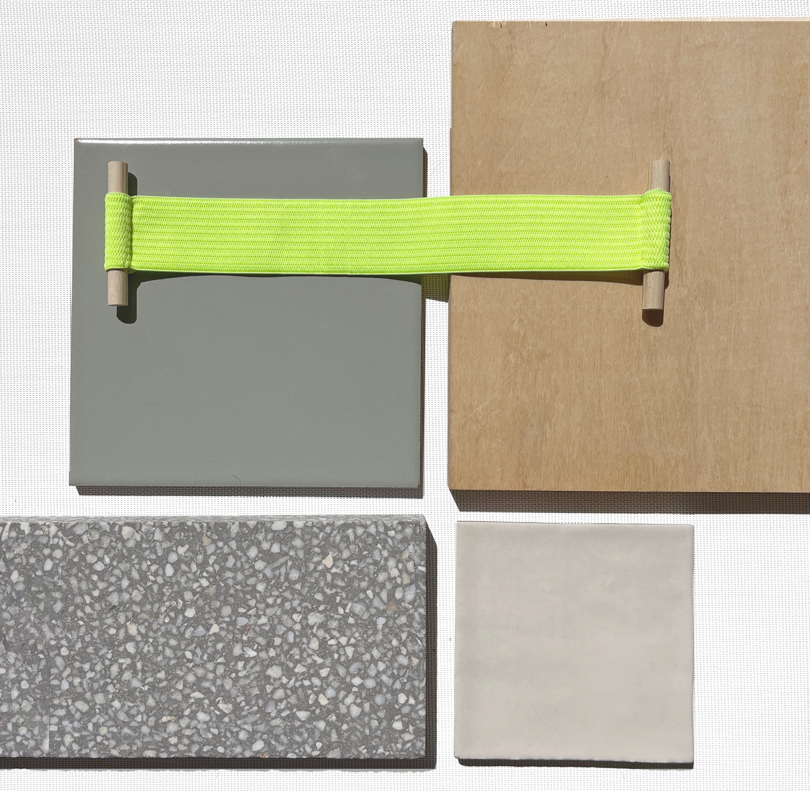 Todos los muebles fueron resueltos en su totalidad con dos materiales económicos y durables: multilaminado de madera de guatambú y enchapado de fórmica de color verde; color que se hace presente también en tapicería, cortinados, azulejos y pintura.